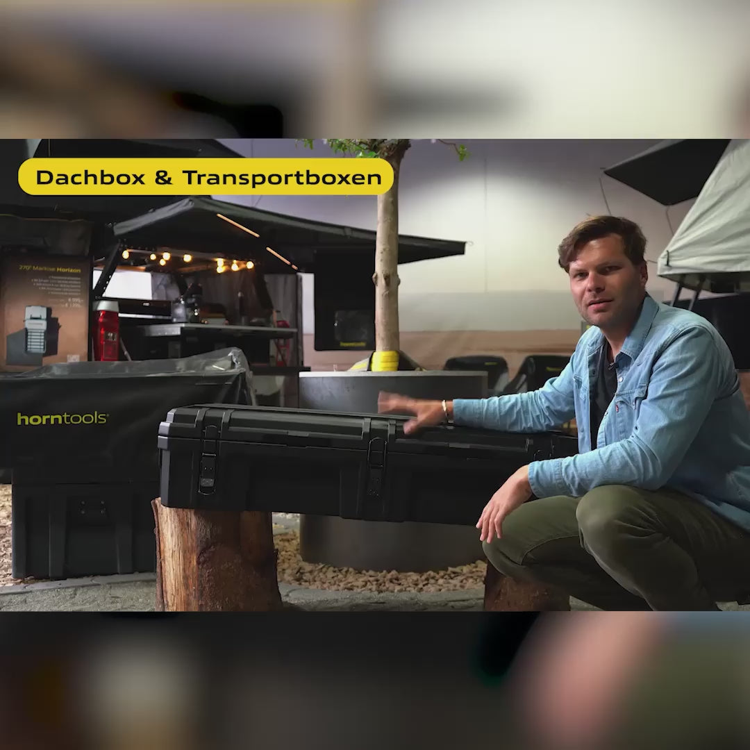 Met de horntools transportbox ben je voorbereid op elk avontuur. Of u nu uw gereedschap, reserveonderdelen, barbecue-uitrusting of brandhout veilig wilt opbergen: het biedt de nodige ruimte en optimale bescherming. Van stoffige expedities op de Balkan tot vochtige tochten door Engeland: deze box is een trouwe metgezel.